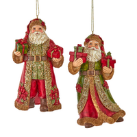 These exquisite & beautifully crafted Santa ornaments, each adorned in rich red and olive green tones that exude elegance and warmth. With intricate glitter detailing and a classic design, these Santa figures capture the spirit of the season. Timeless