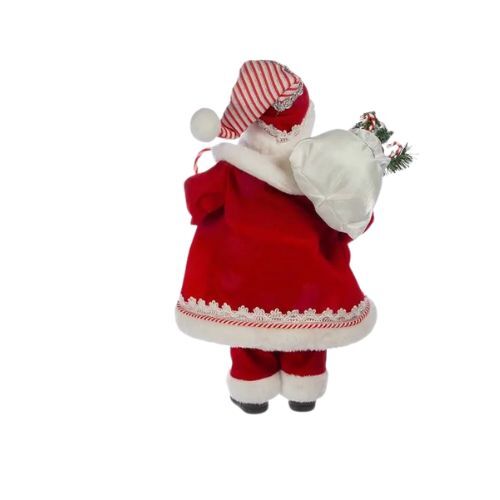 This 17.5-inch Kringle Klaus standing red and white peppermint Santa from Kurt Adler is a fun and festive addition to any holiday décor. Part of the Kringle Klaus collection, Santa is featured here wearing a red and white peppermint style Santa suit with a matching Santa hat and black boots. He is carrying a sack filled with greenery and peppermint candies and a peppermint candy cane